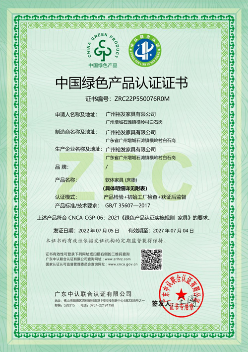 • 中国绿色产品认证证书(床垫)