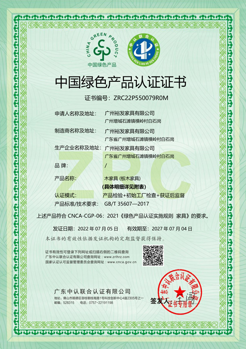 • 中国绿色产品认证证书(板木家具)