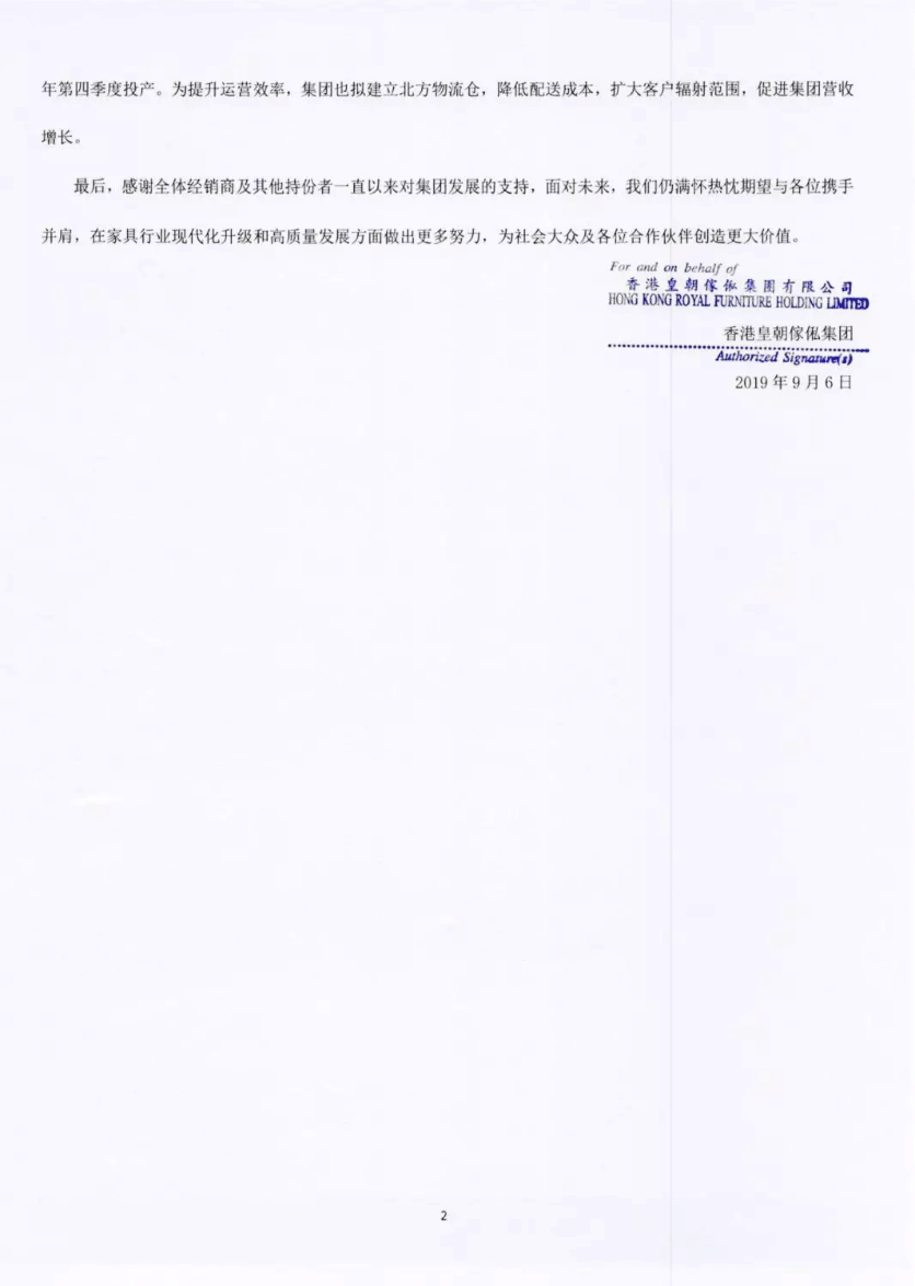 最后,感谢全体经销商及其他持份者一直以来对集团发展的支持,面对未来,我们仍满怀热忱期望与各位携手并肩,在家具行业现代化升级和高质量发展方面做出更多努力,为社会大众及各位合作伙伴创造更大价值。