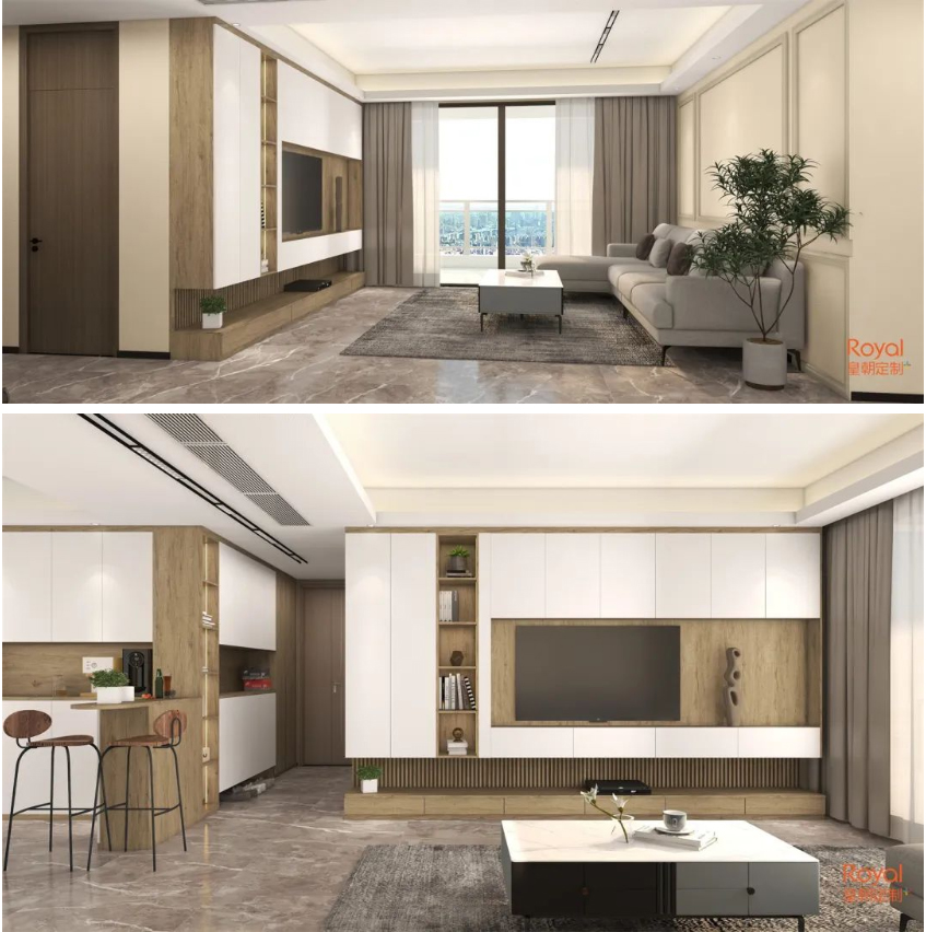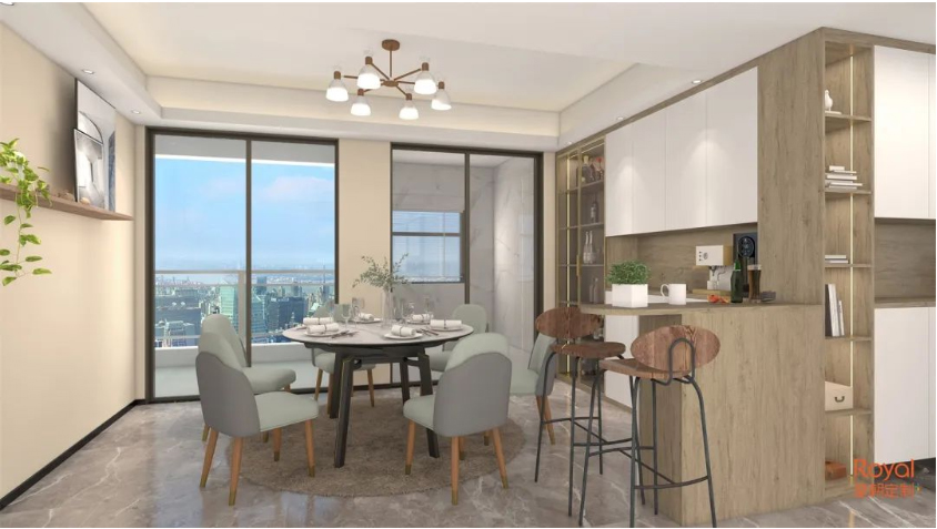 餐边柜延伸出来的小吧台,自是一处休闲好天地。同色设计的玄关鞋柜与餐边柜连成一片,功能藏纳其中,尤显和谐。