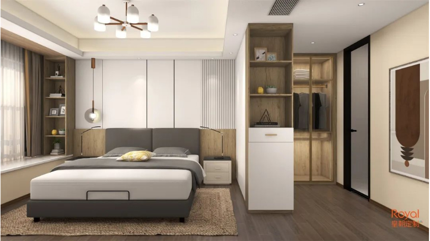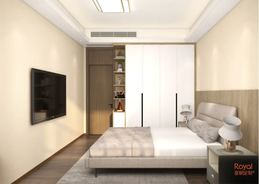 卧室进门处开辟了衣帽间空间,自然的配色加上灯光的加持,空间变得温煦柔和,整然有序的的布局,为居室增添无限的优雅美感。