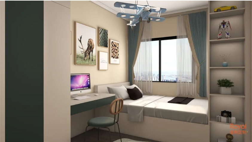 说是书房,其实也是适合孩子住的多功能房,书房隐藏灯带的考究妙用,家具一体组合,撞色般的窗帘提升了空间的纵深感。
