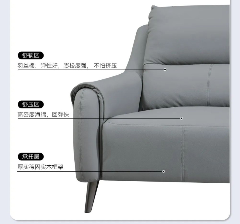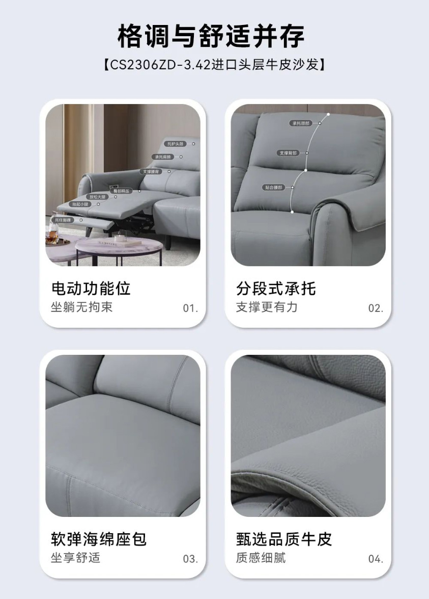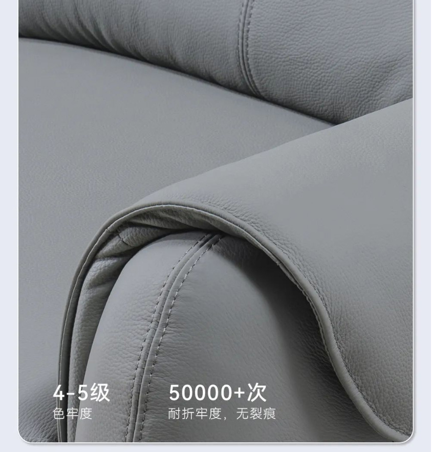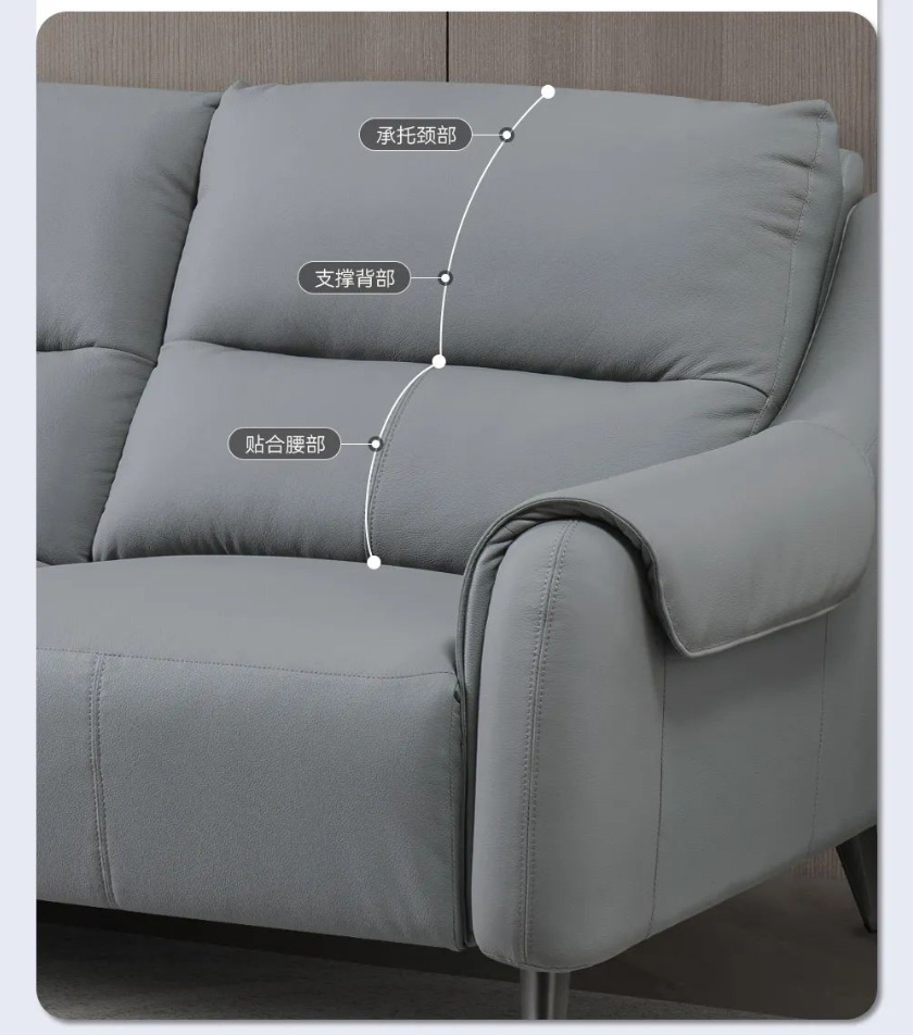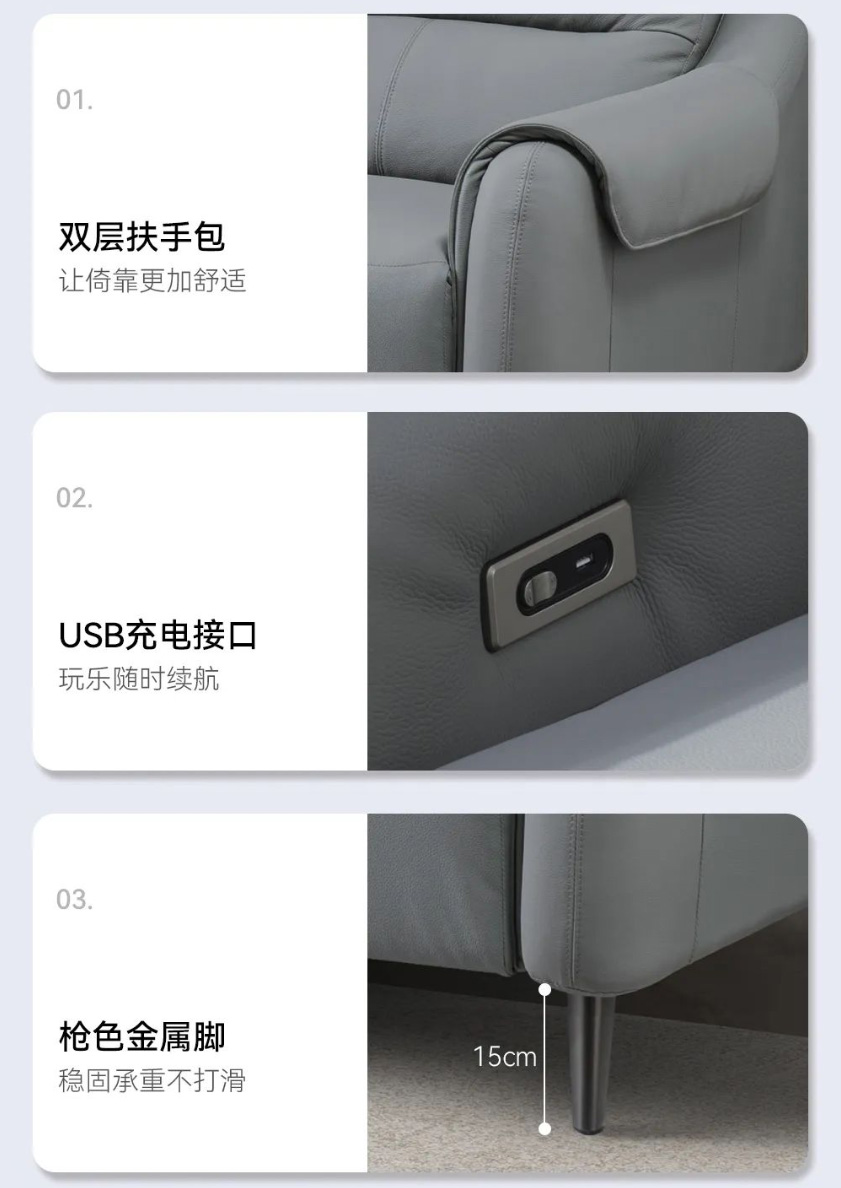 以遨游宇宙的太空舱为设计灵感,沙发整体轮廓柔和,低饱和度的灰色沉稳耐看。沙发面料采用进口头层牛皮,肌理自然清晰,肤感柔软舒适;电动贵妃位可实现110~160°自主调节,即按即停,一键深度放松,解锁花式坐靠躺;沙发靠背上下分段,充分贴合肩颈腰背,柔软舒压;靠包饱满填充高密度海绵,用料实在,给你软而不塌、弹性十足的坐感;双层扶手设计,手臂搭靠的时候更加自然舒适;便捷USB充电口的加持,不用担心玩乐断电;还配有高挑金属脚,稳固承重,清洁也更省心。
